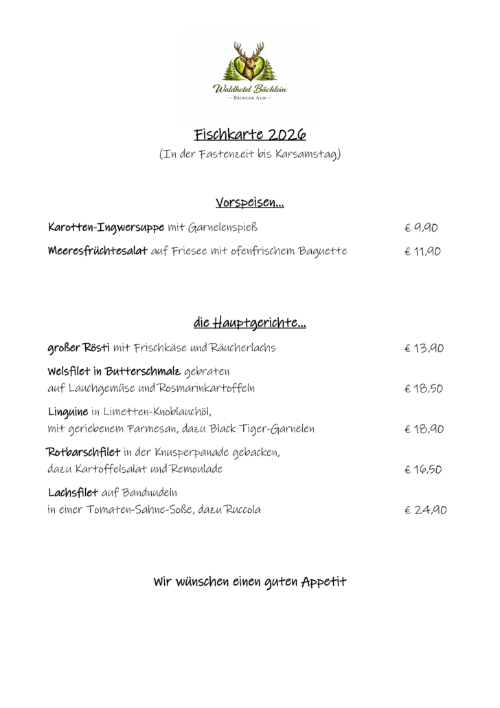 Zusatzkarte in der Fastenzeit bis zum Karsamstag, zusätzlich zur Hauptkarte. Wir bitten um Vorreservierung!